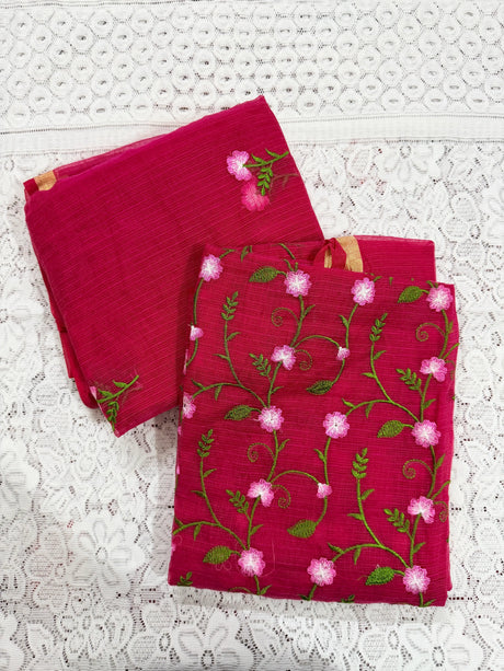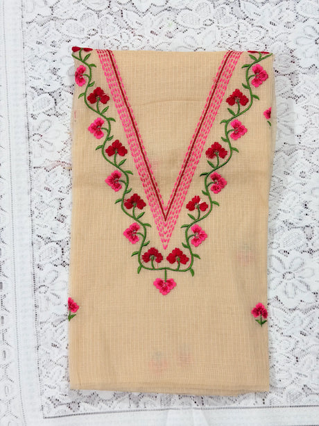 Pink Cotton Kota Doria Unstitched Suit Set with V-Neck Embroidery | Elegant Party & Festive Wear