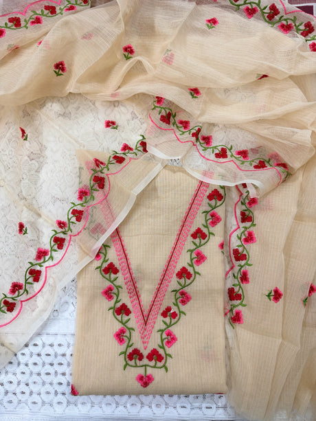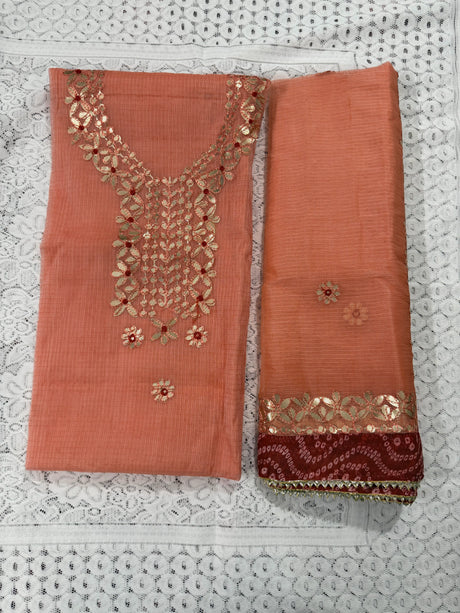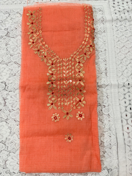 Peach Cotton Kota Doria Unstitched Suit Set with Heavy Golden Embroidery | Wedding & Party Wear