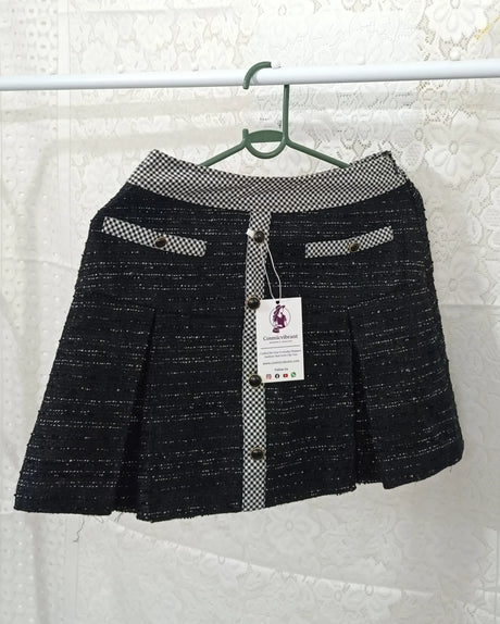 Women’s Black Tweed A-Line Mini Skirt – Contrast Waistband & Button Detail