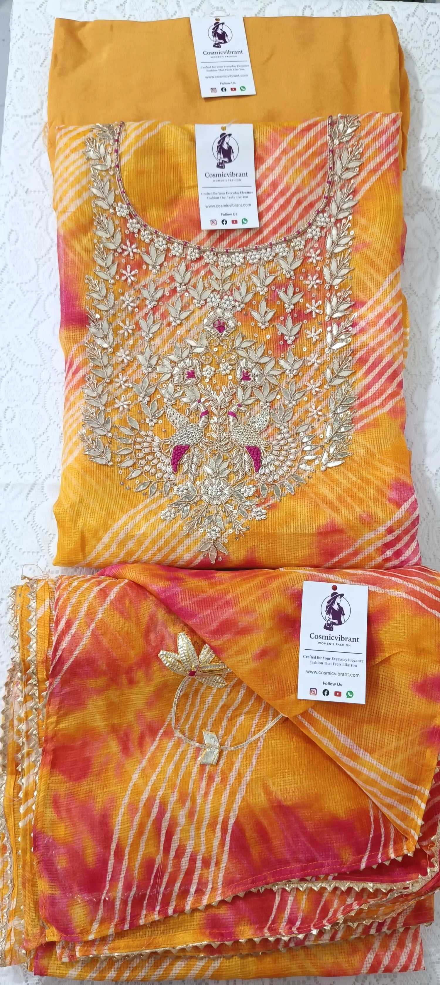 - Beautiful Orange tie-dye pattern with golden handwork motifs