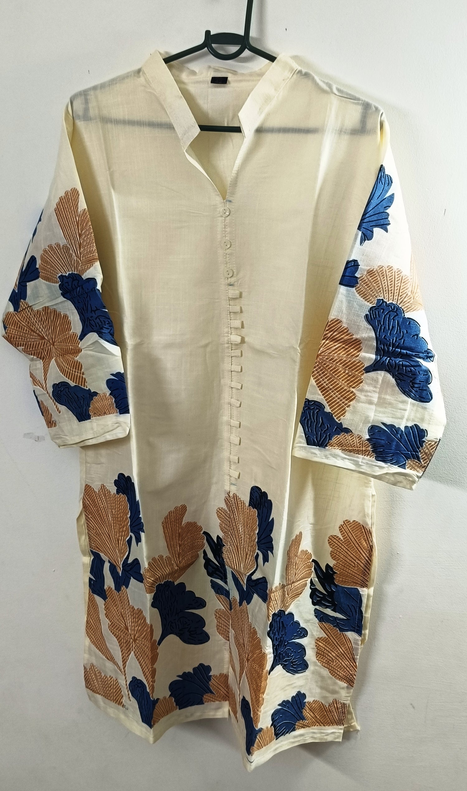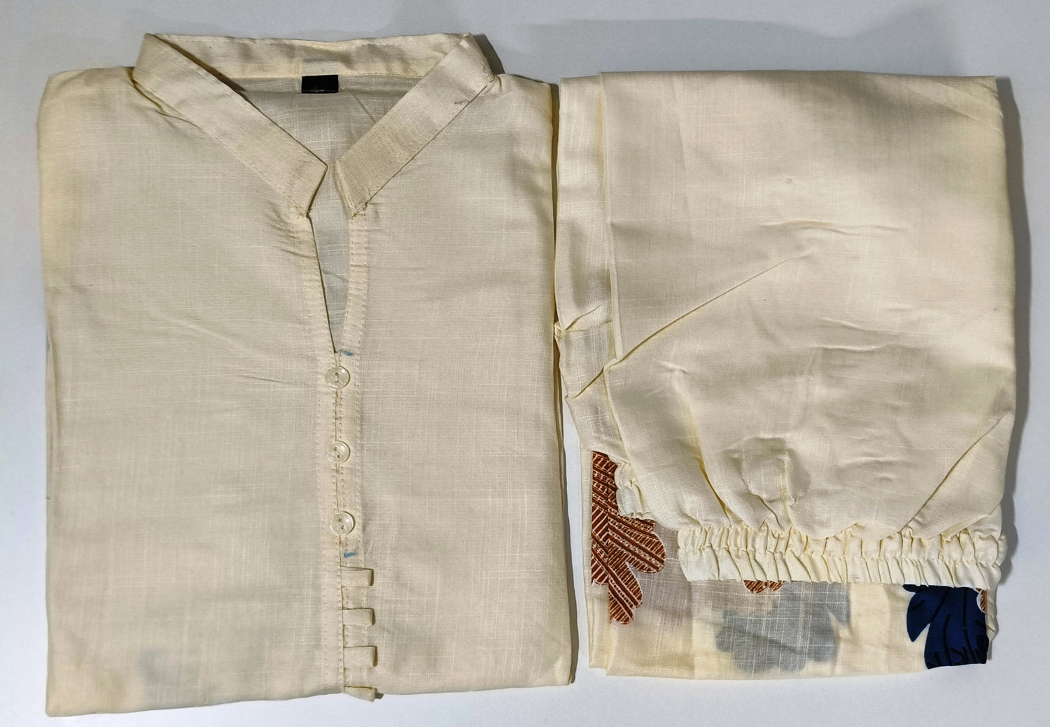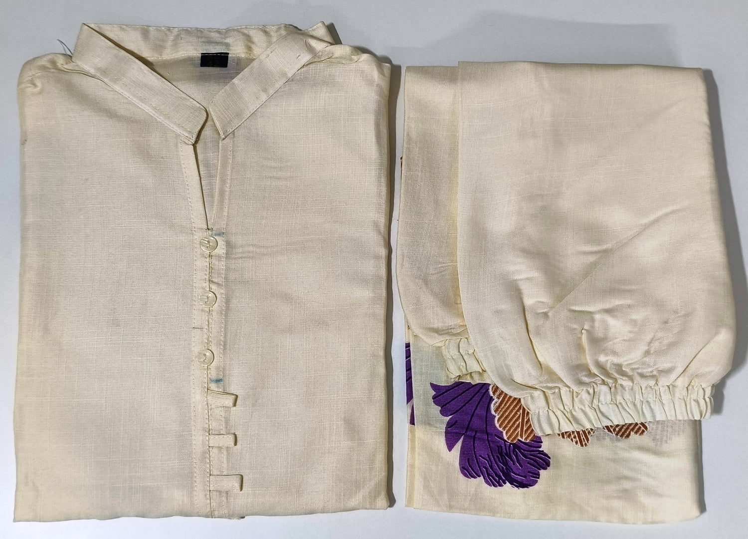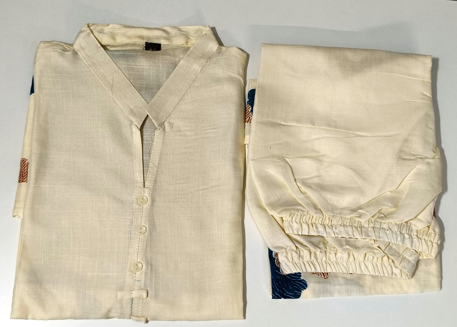 Top Fabric: Cotton Bottom Fabric: Cotton Sleeve Length: Long Sleeves Net Quantity (N): 1 Sizes: XXL (Top Bust Size: 44 in, Top Length Size: 32 in, Top Hip Size: 47 in, Bottom Waist Size: 36 in, Bottom Hip Size: 46 in, Bottom Length Size: 38 in) Country of Origin: India
